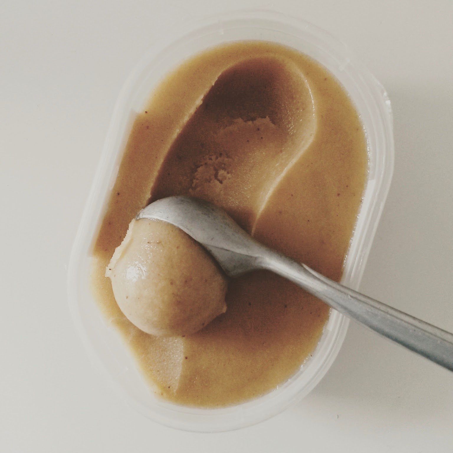 6) Når den er helt afkølet, skal den køres på ismaskinen i ca.30 minutter eller indtil den ønskede konsistens er der. Spis den enten direkte, eller put den i en boks og hav den i fryseren til en anden god gang :)
