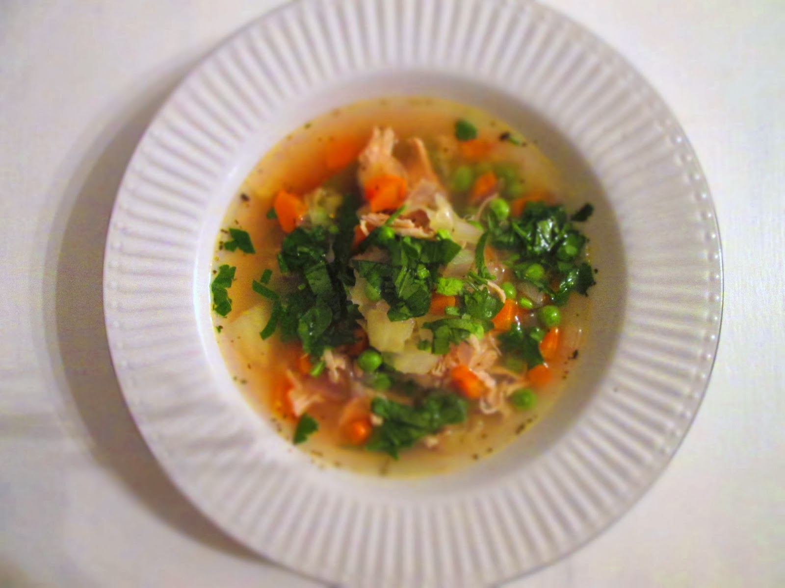 5) Når kyllingen er stegt færdig rives kødet fra hinanden med to gafler og tilsættes suppen. Lad det herefter simre i 5 minutter