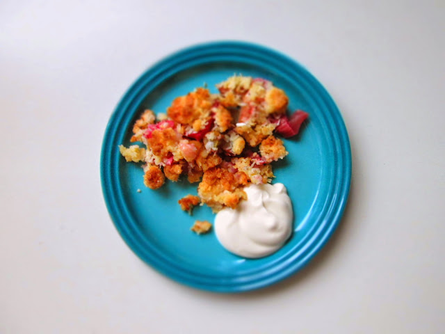 Så nu har jeg lavet både lækker rabarber/lakrids sorbet (lakrids og rabarber går super godt sammen), rabarbersaft med vanilje og så denne rabarbercrumble.. Og så er der røget 5 kilo i henholdvis køleskab og fryser, pyha.. :)