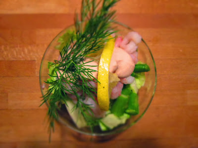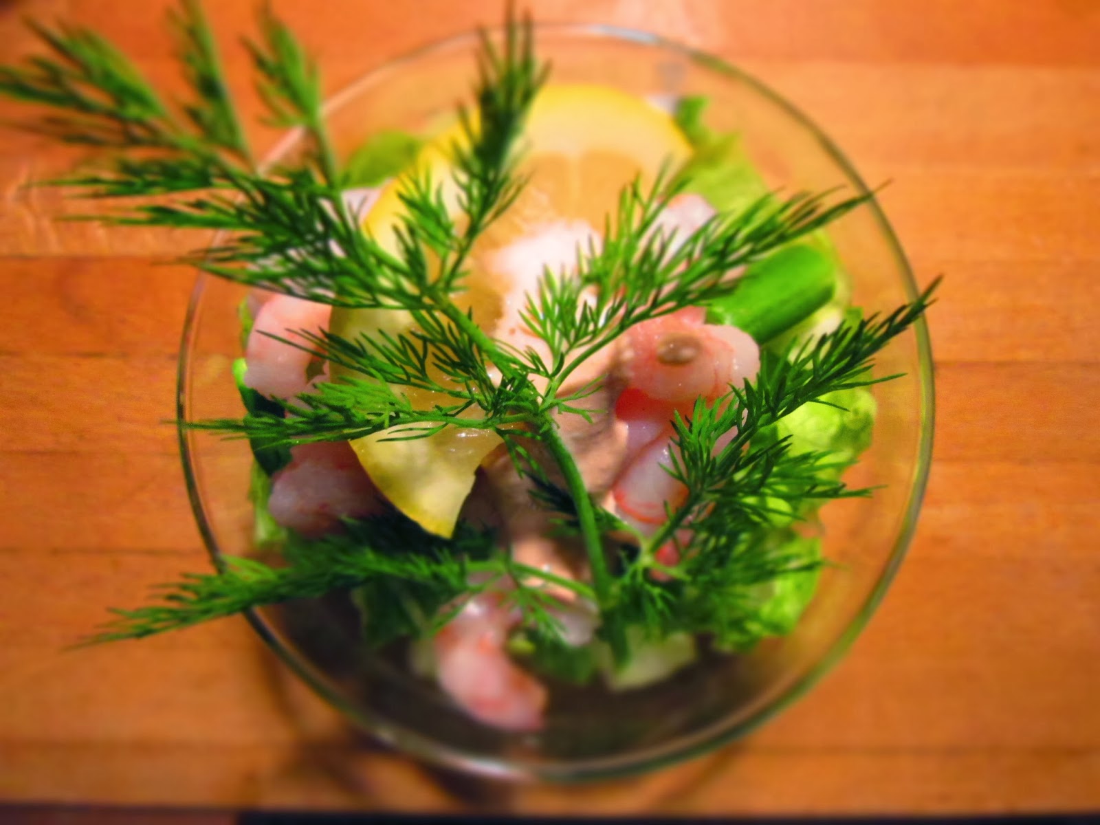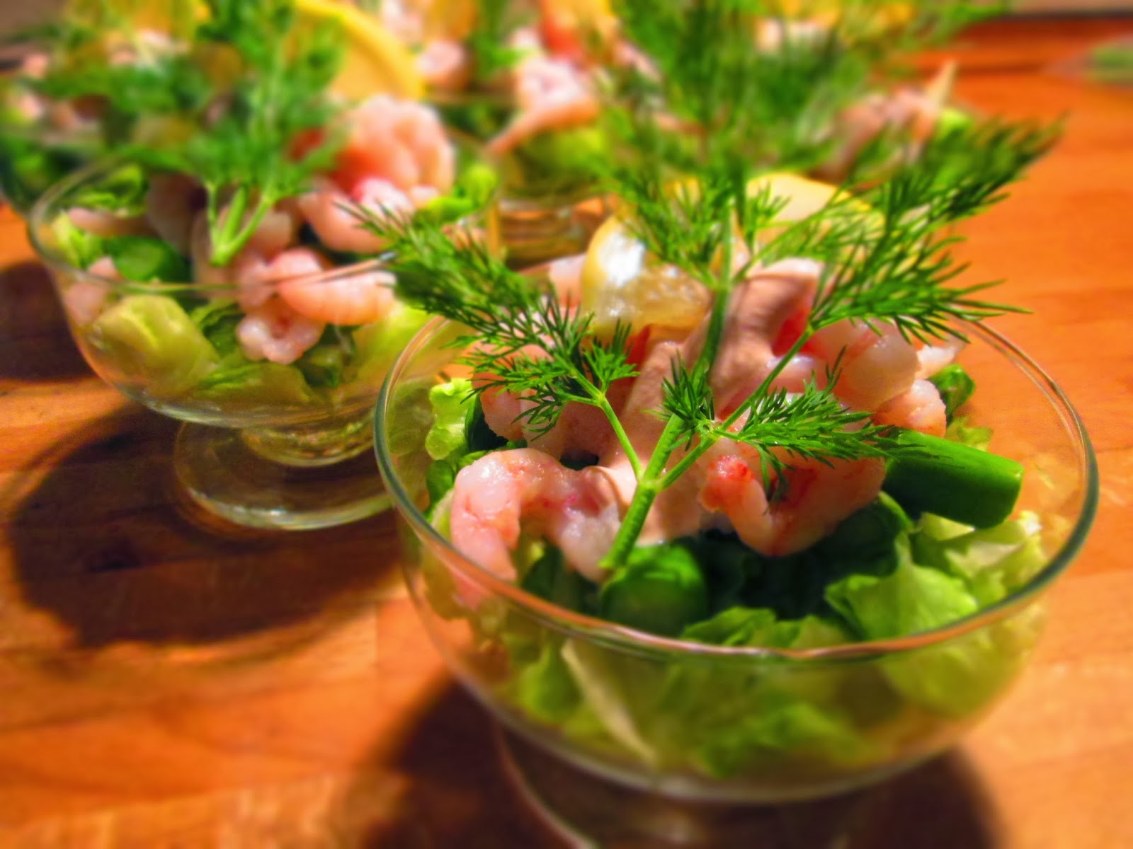5) Læg rejerne i serveringsglassene og pynt med en klat dressing og en dusk dild