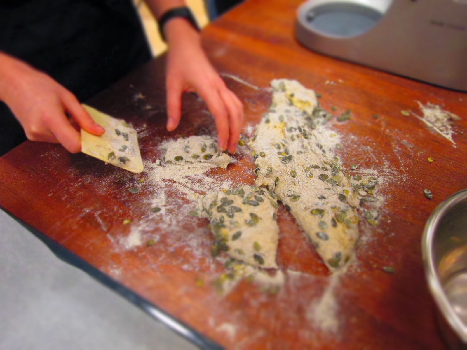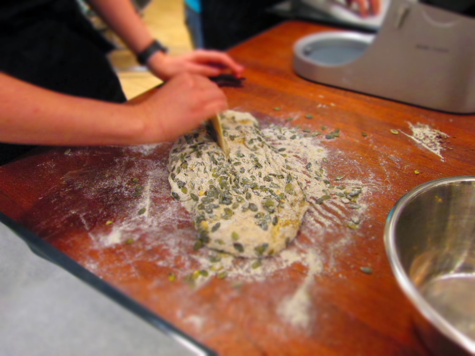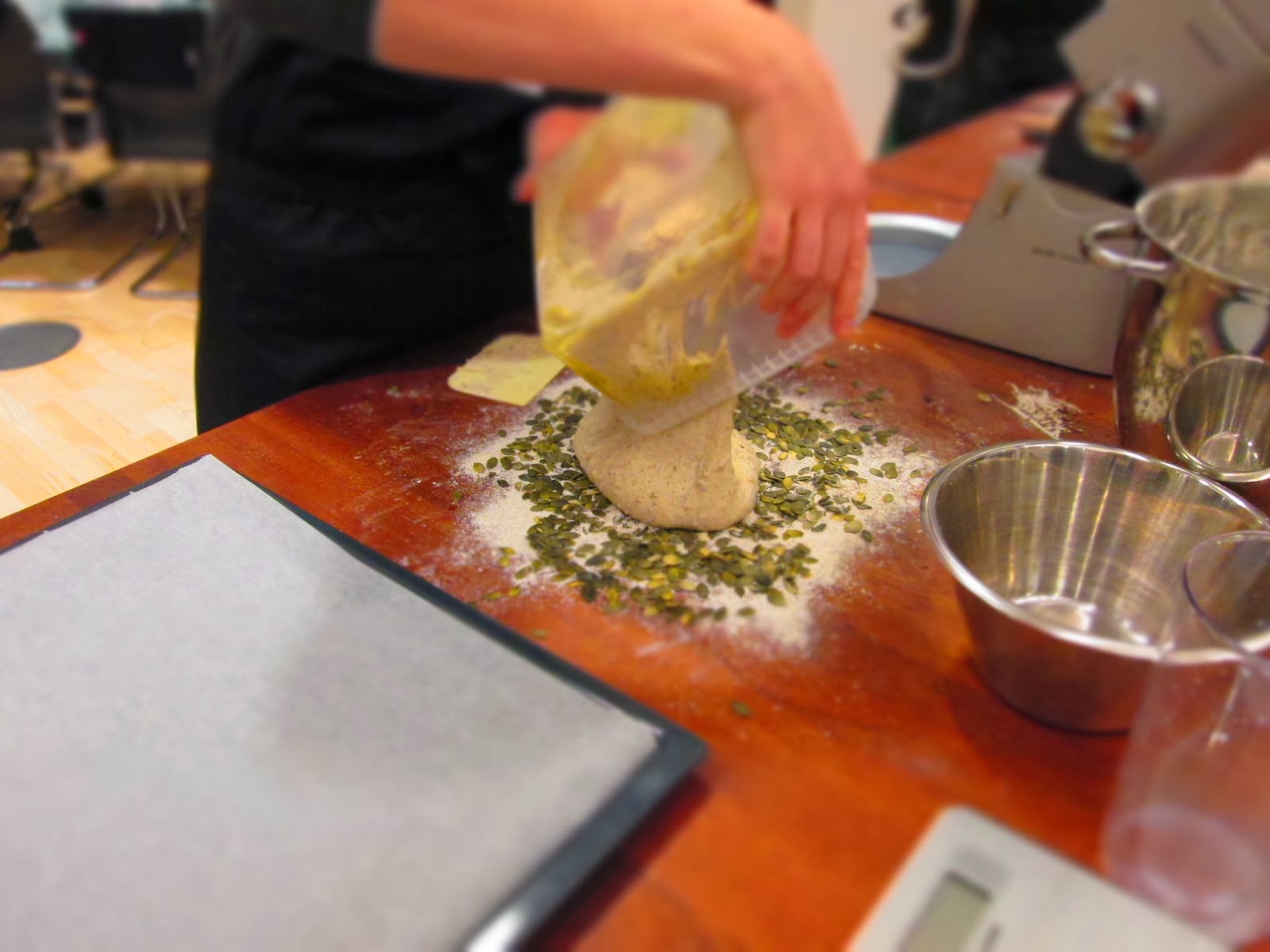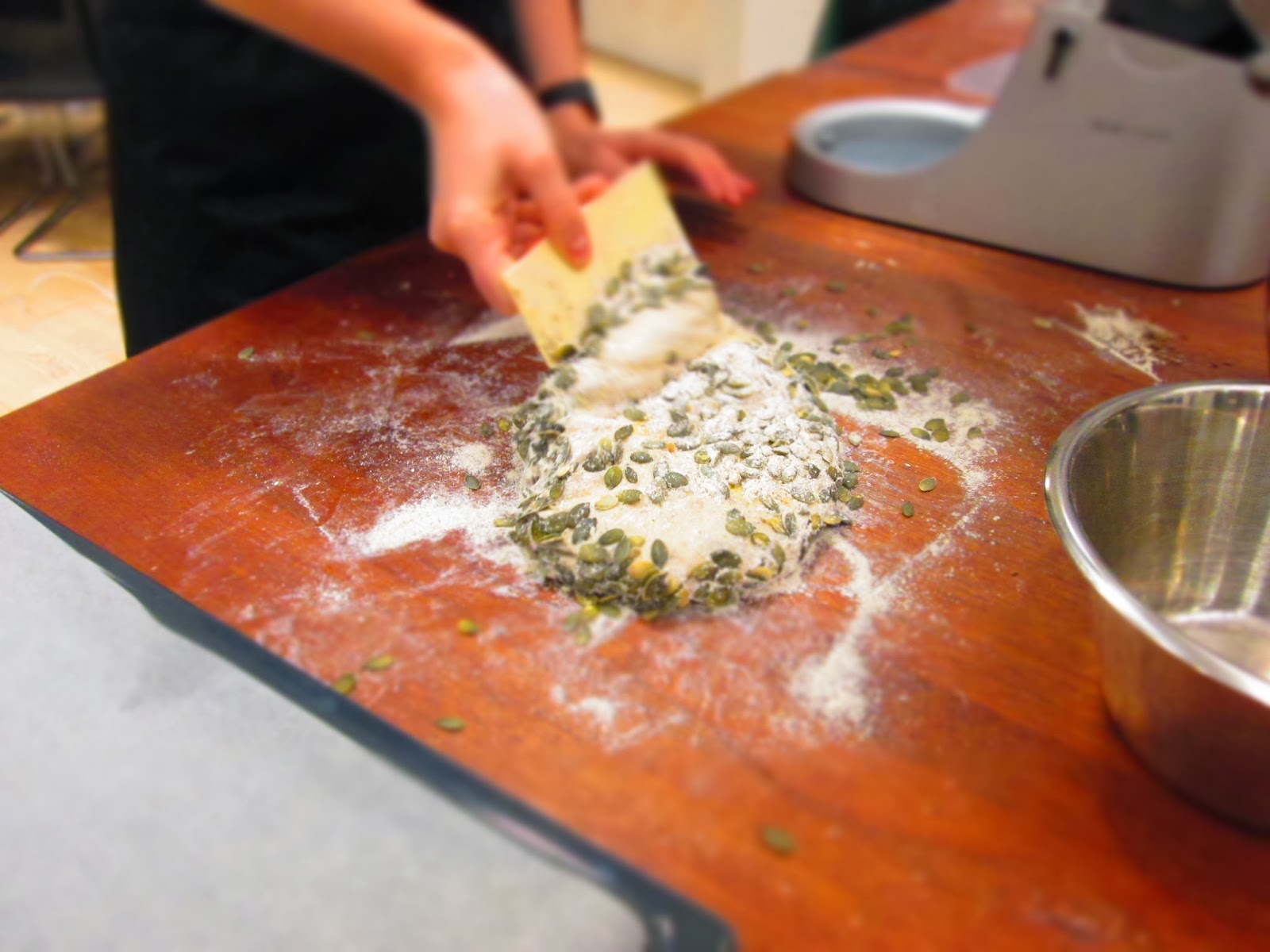 8) Dejen hældes nu ud på et mel- og kernedrysset bord og siderne foldes ind over hinanden, så der kommer kerner på alle sider af dejen (brug en dejskraber til at vende siderne ind over hinanden)