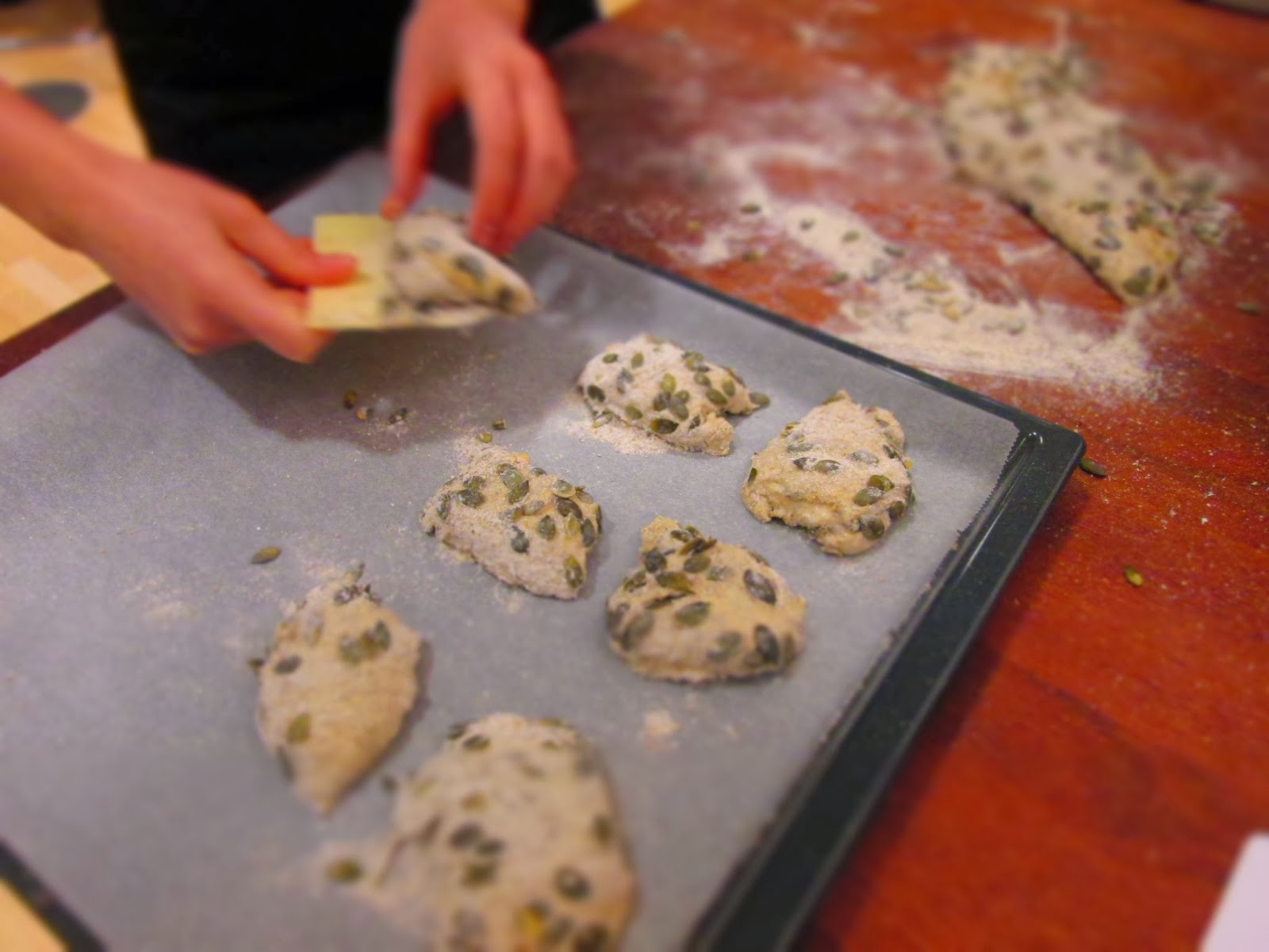 9) Skær dejen over på langs og skær dem ud i små boller (læg dem hurtigt på en bageplade, da dejen er ret våd/tynd)