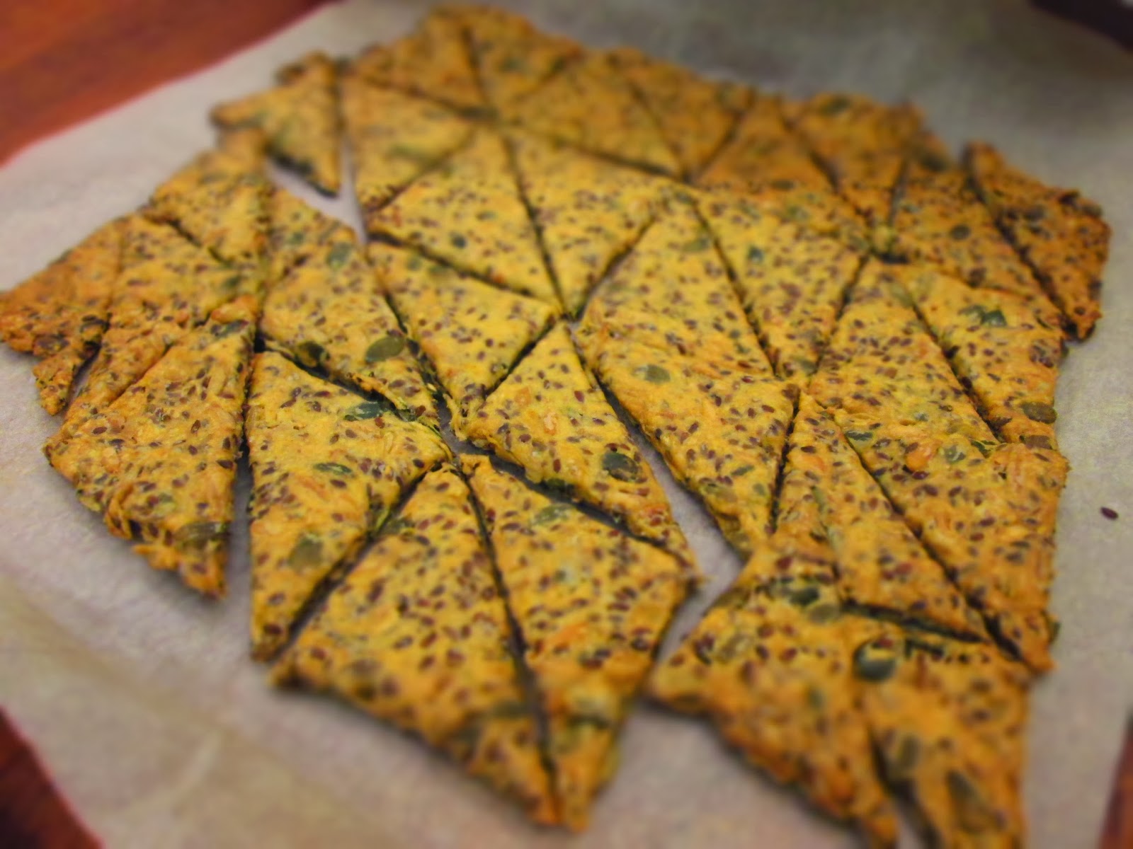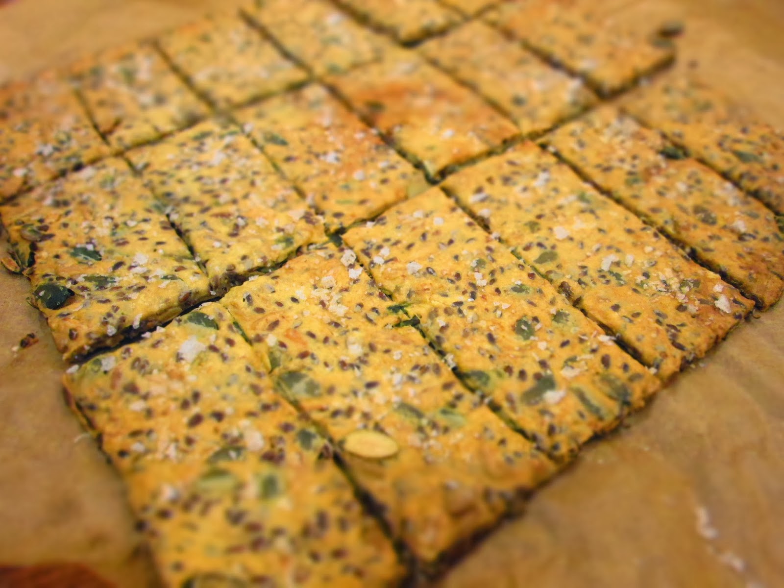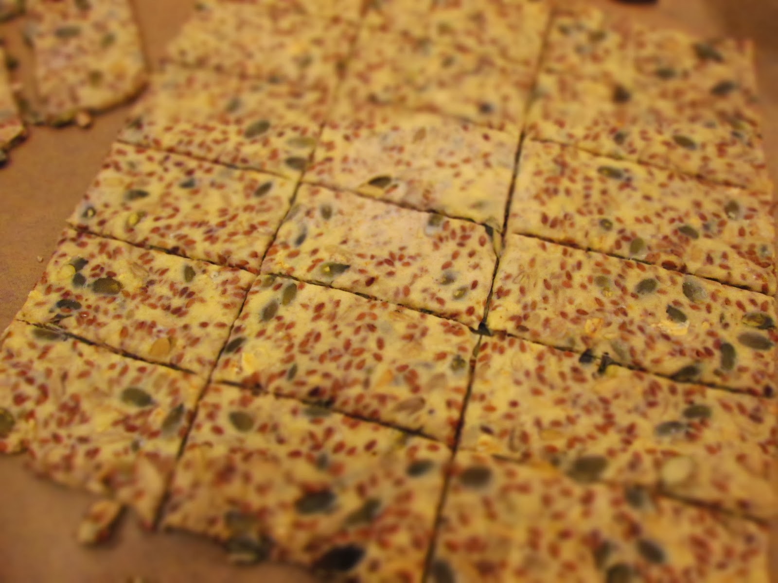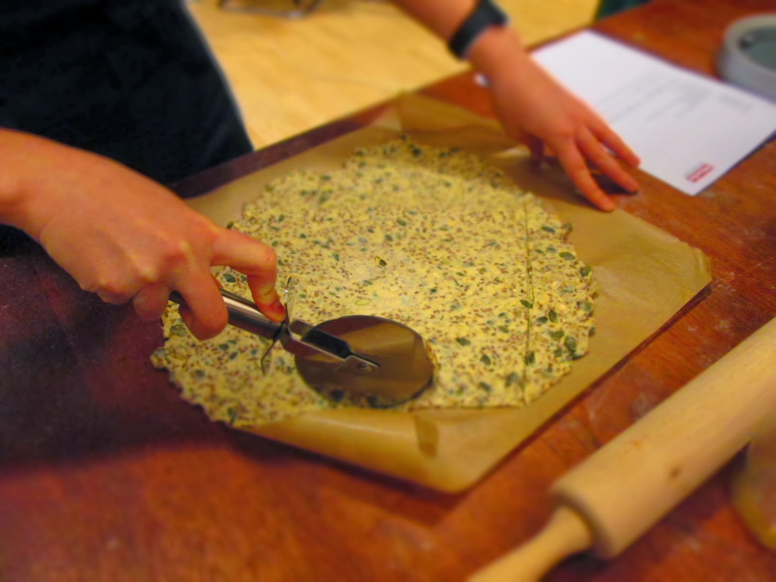 3) Fjern det øverste stykke bagepapir og skær dejen ud i passende knækbrød størrelser