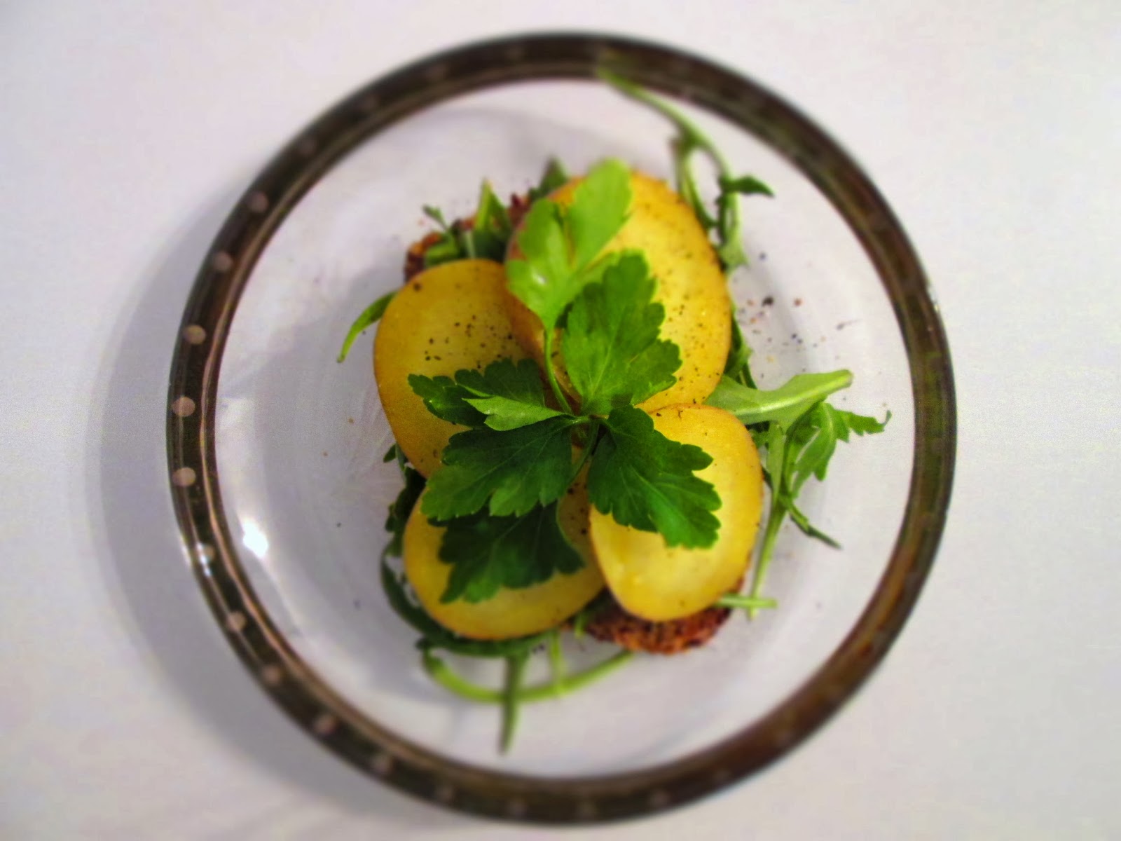 3) Skær kartoflerne i skiver og anret dem oven på ruccolaen