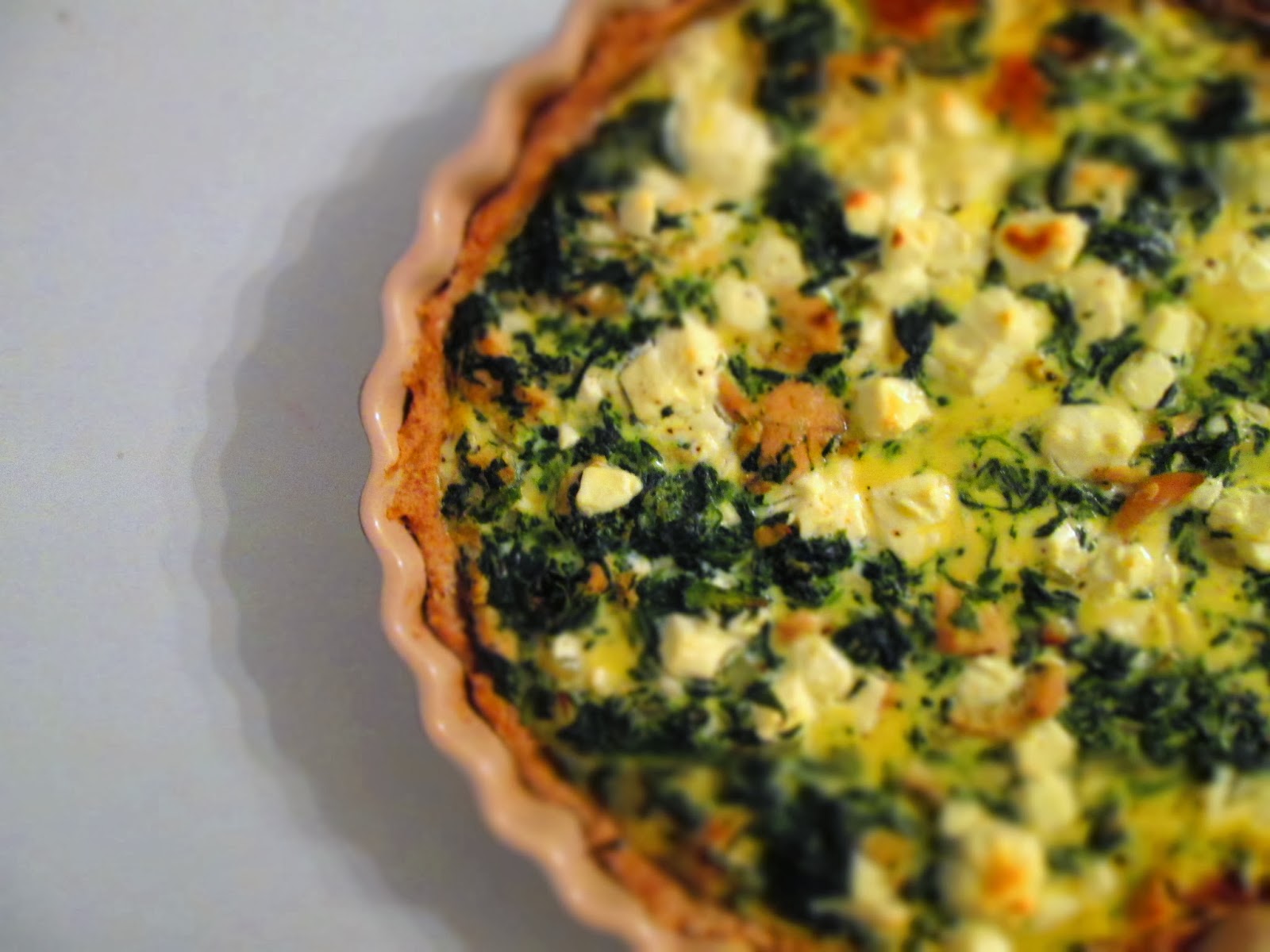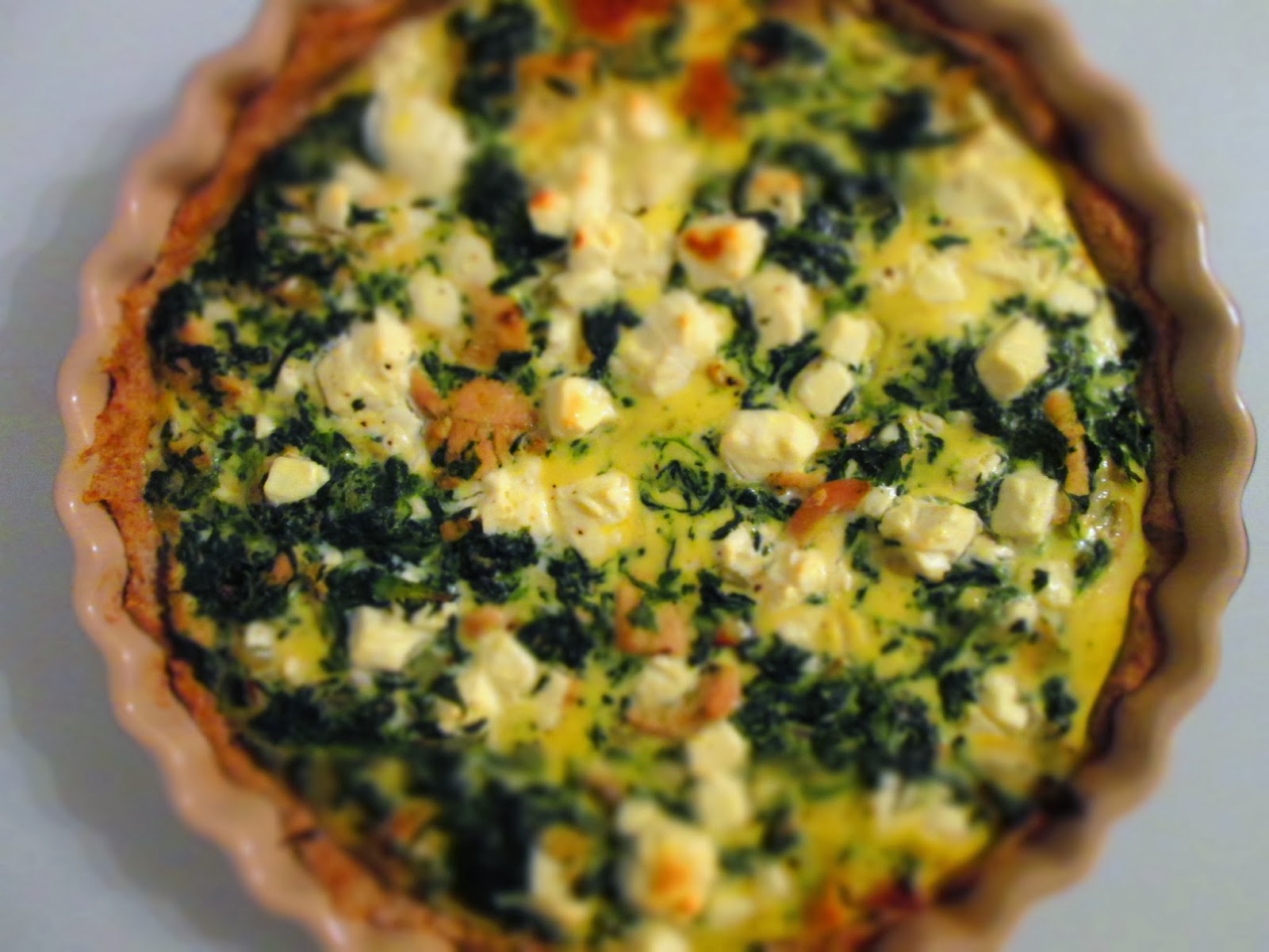 9) Fordel kylling/spinaten ud over tærtebunden, læg fetaen på og hæld æggemassen over