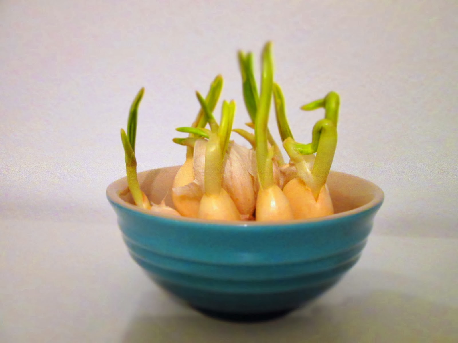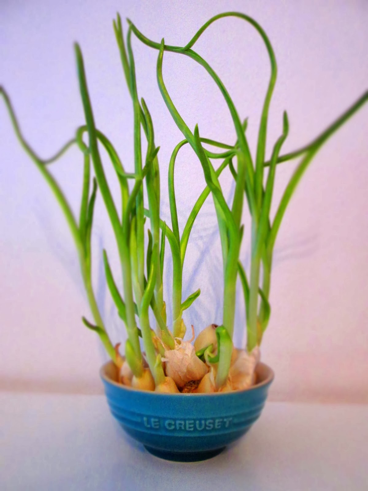 Når hvidløget begynder at spire sætter du det med bunden ned af og de begyndende spirer opad, i en lille skål med lidt vand i. Efter et par dage begynder der at udvikle sig et flot rodnet og spirerne vokser stille og roligt derudaf! Hvidløgene "smider" efterhånden den hvide skal, så du kan let pille den af. Når de har nået en vis højde kan du begynde at høste af den og snitte de fine lysegrønne spirer med en mild hvidløgssmag til en salat, som drys til suppen eller som del i en wokret!