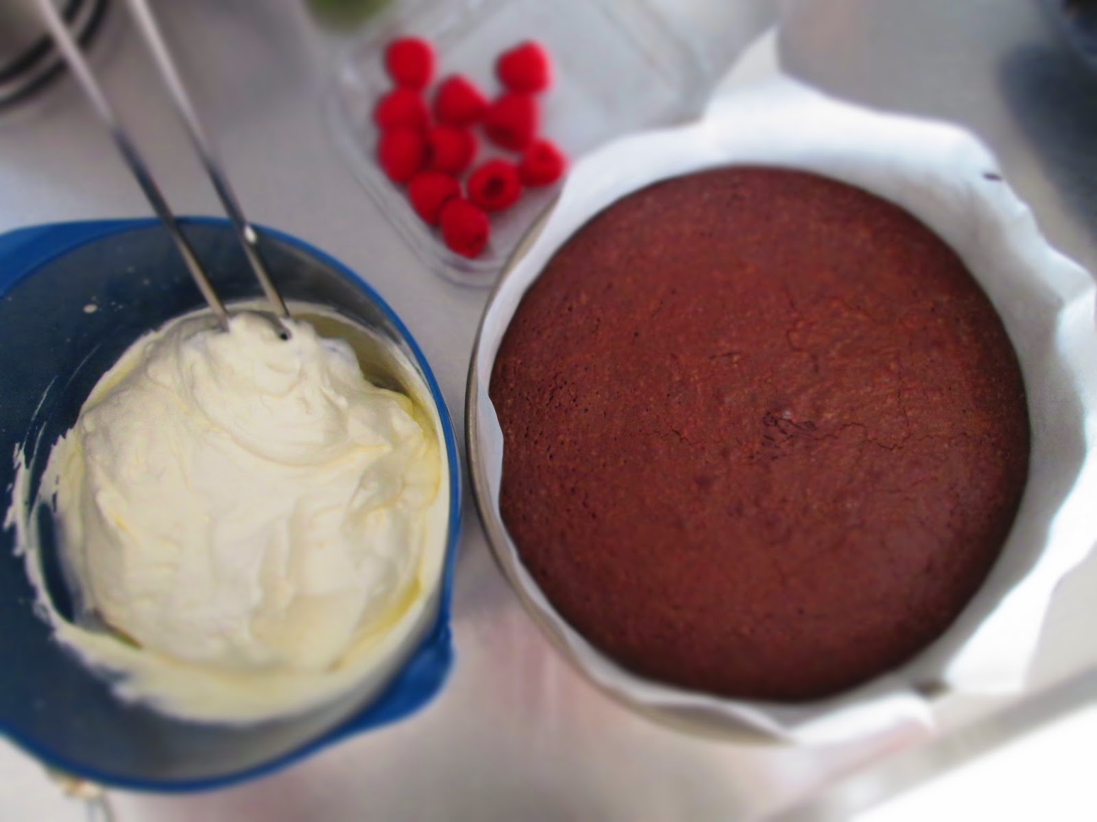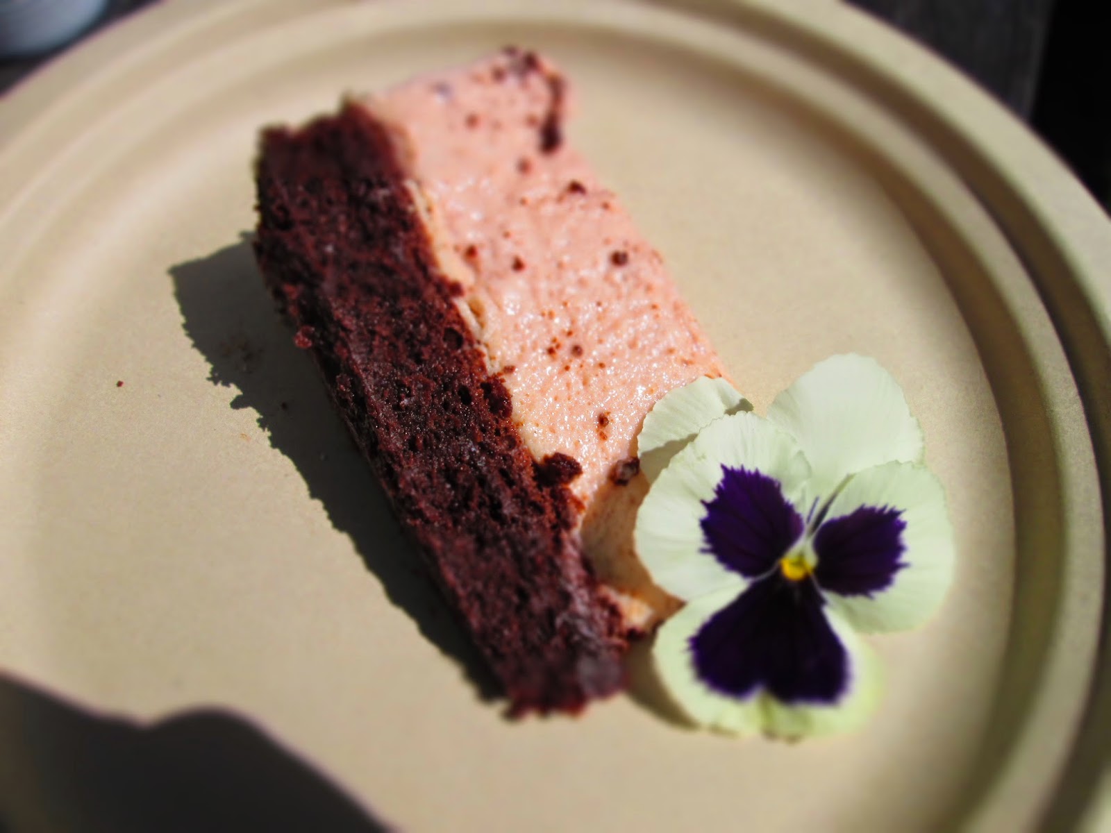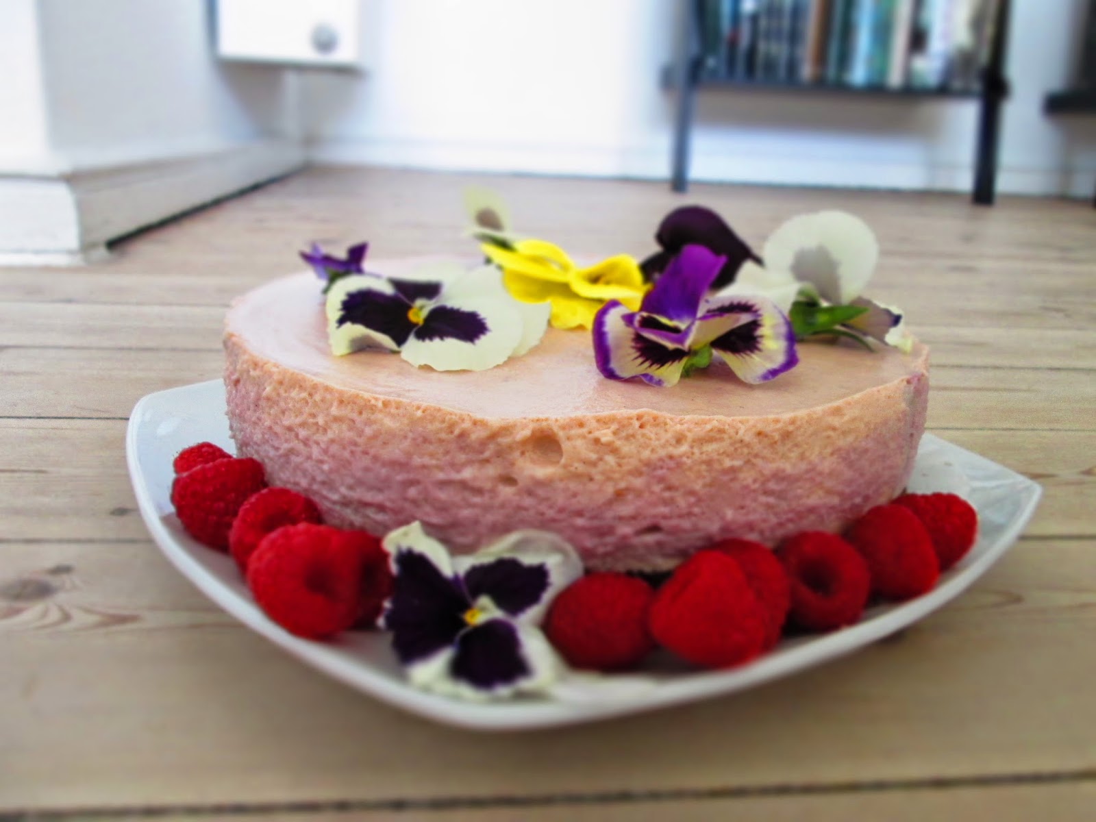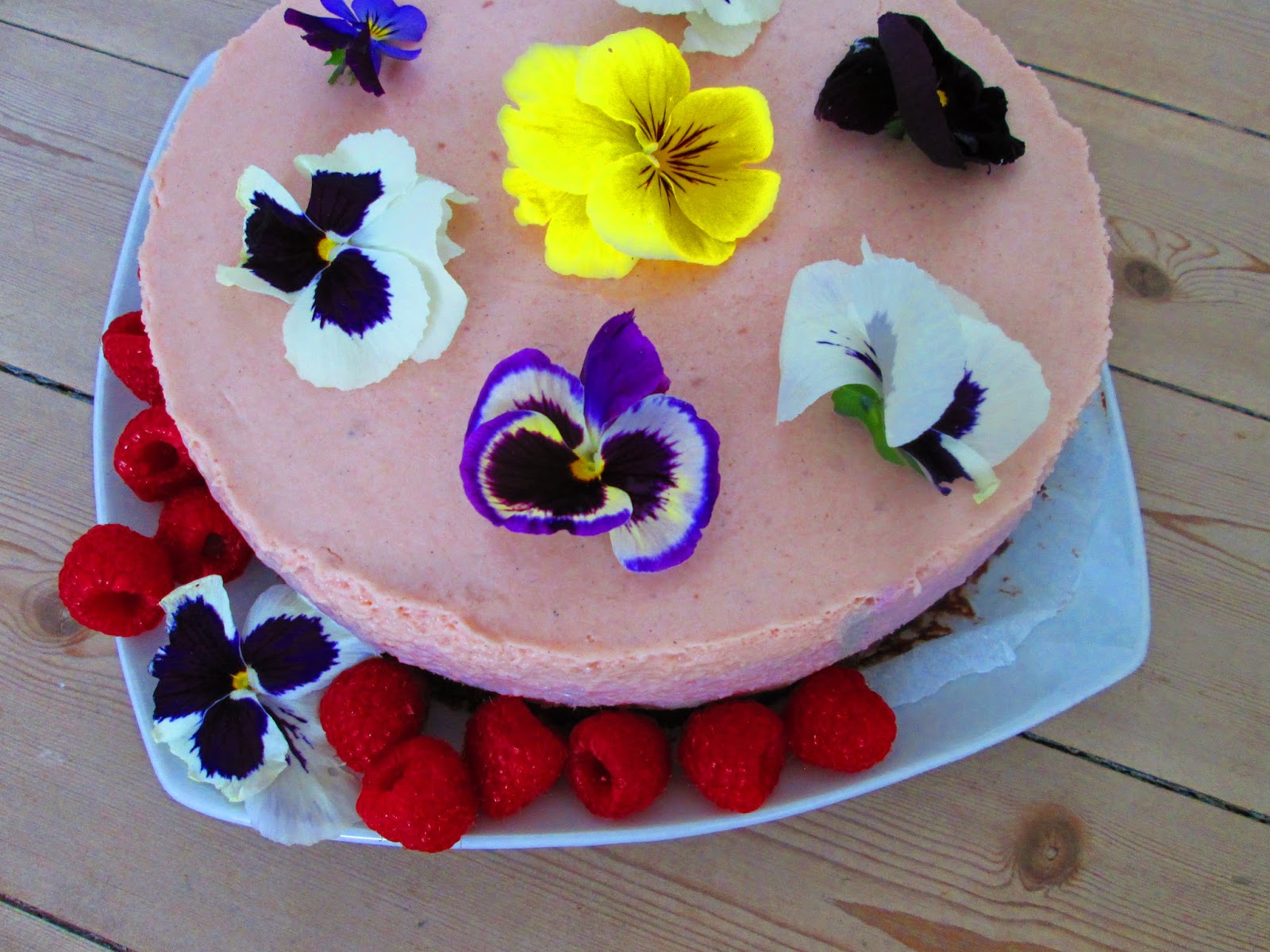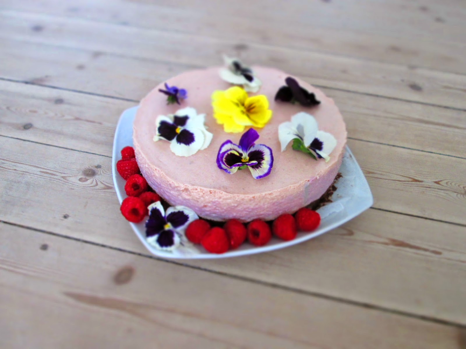 4) Da kagen blev serveret pyntede jeg den med spiselige blomster og hindbær. Du kan også pynte den med andre bær, frugtgelé, guldflager, blade eller krymmel