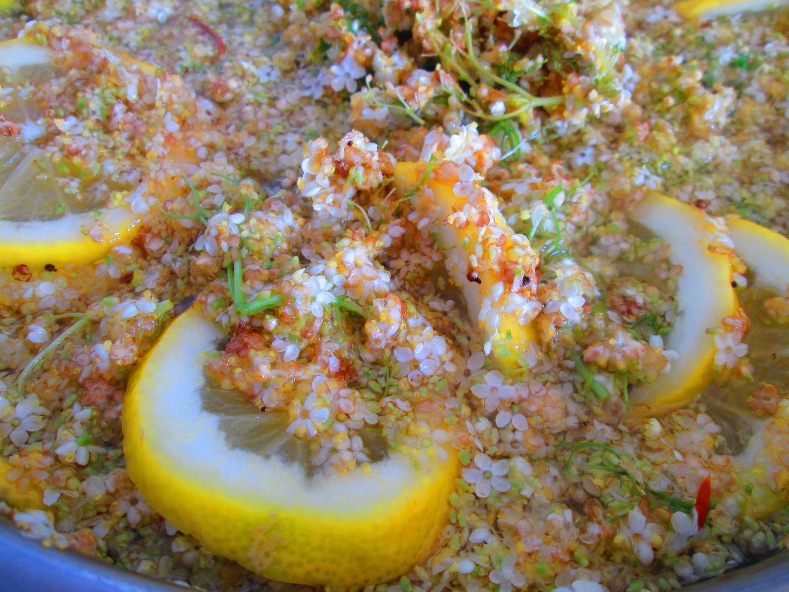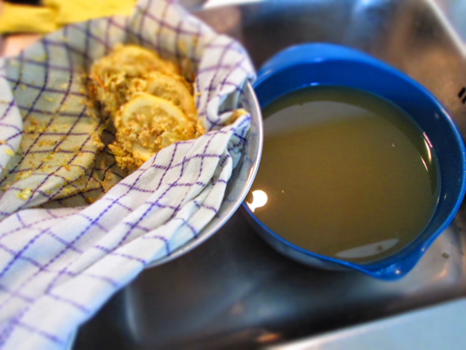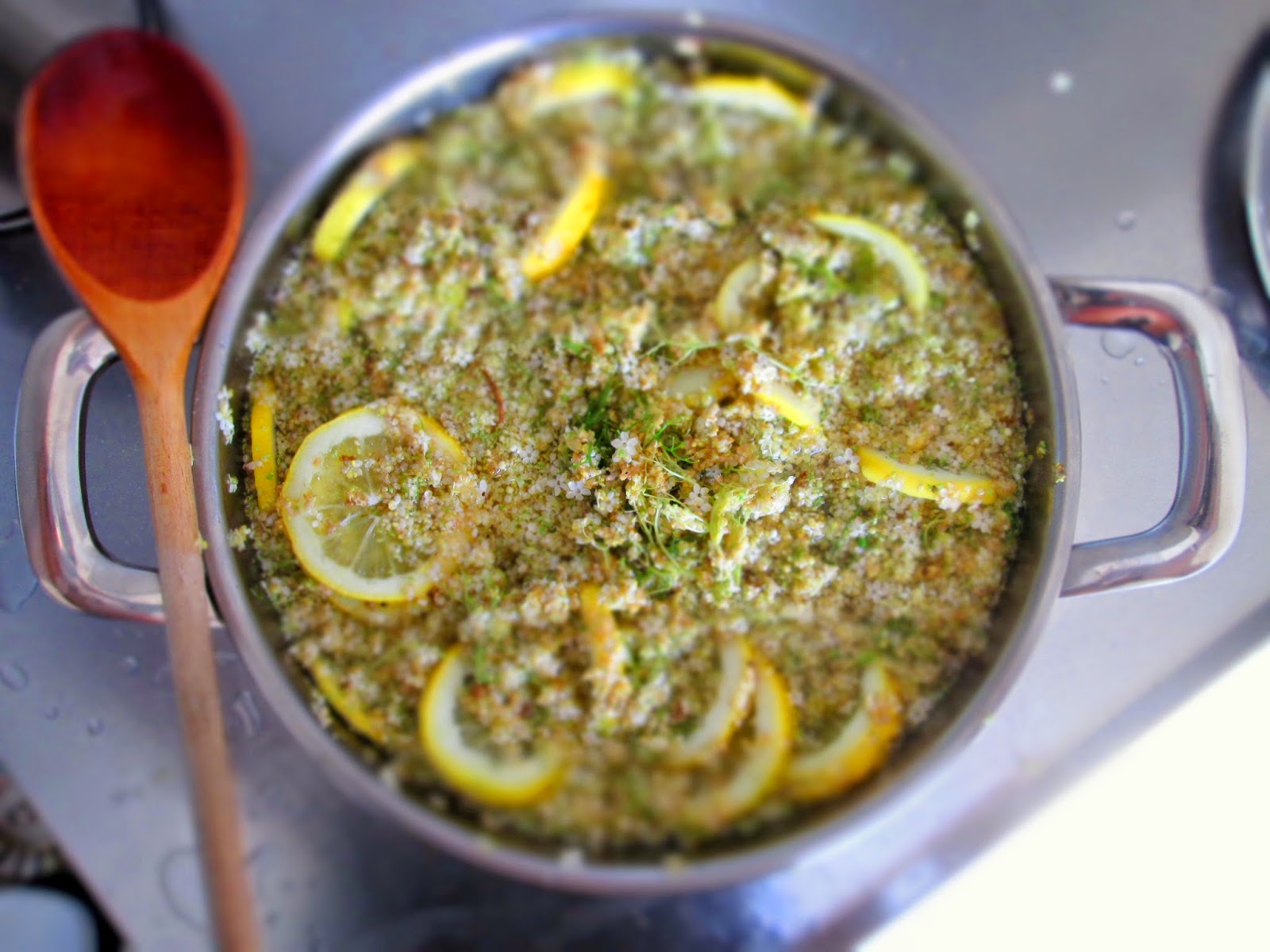2) Vask citronerne og skær dem i tynde skiver. Læg dem ovenpå hyldeblomsterne