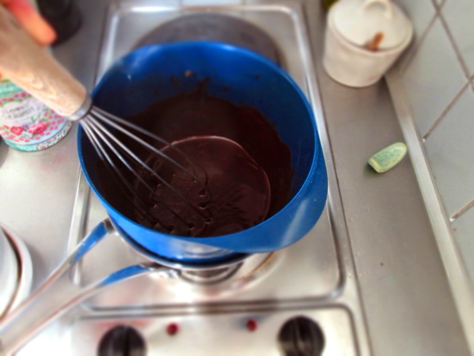 - Når begge dele er smeltet tages skålen af vandbadet og sukkeret røres i