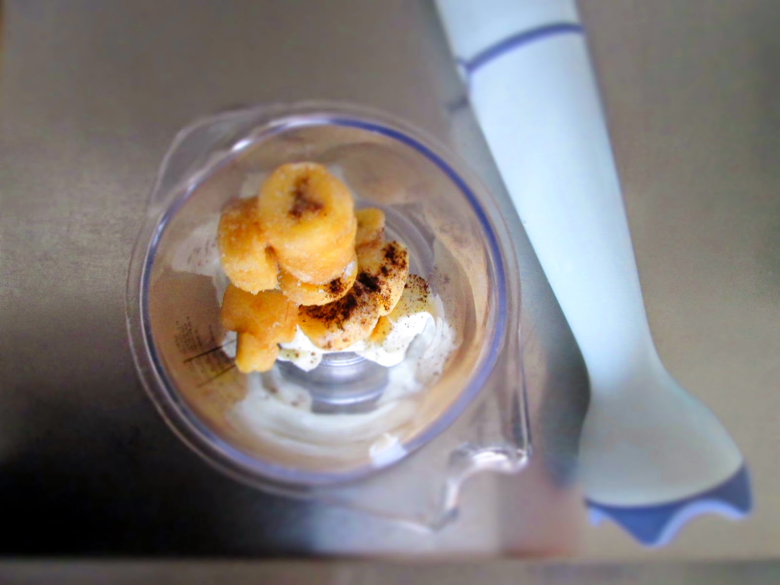 | Blend bananskiver, skyr og vanilje til en cremet bananis |