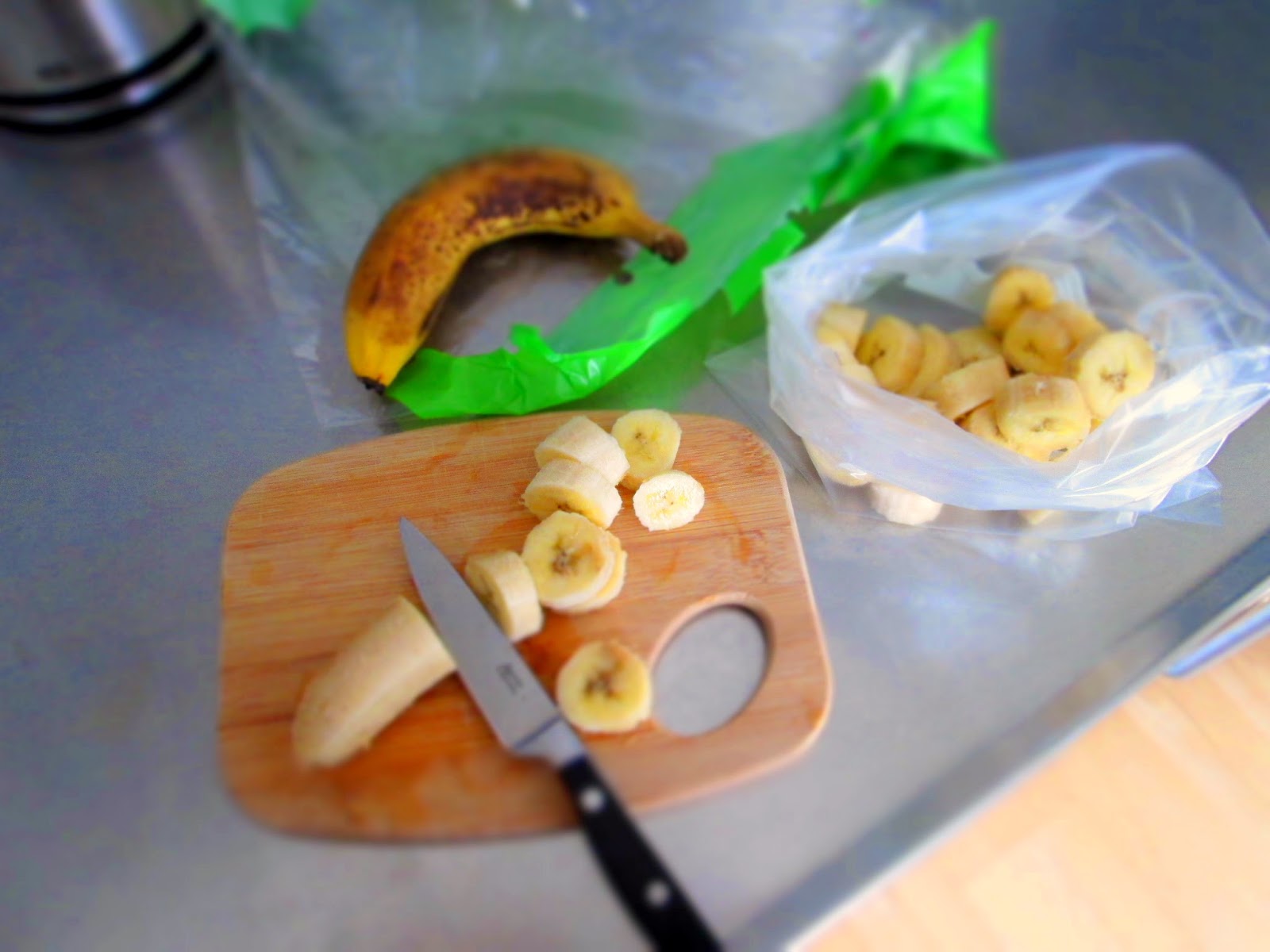 1) Skær bananen i skiver, put dem i en pose og frys dem