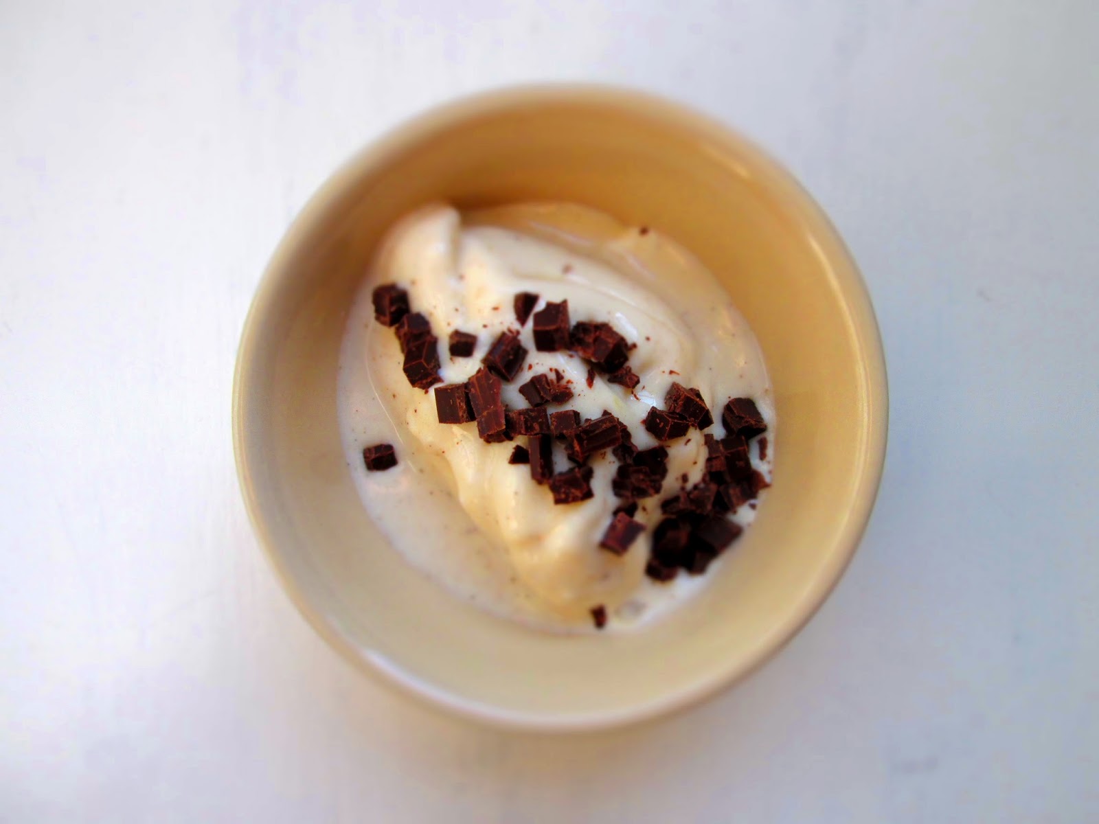 | Sund bananis af modne bananskiver, skyr og vanilje. Her drysset med mørk chokolade |