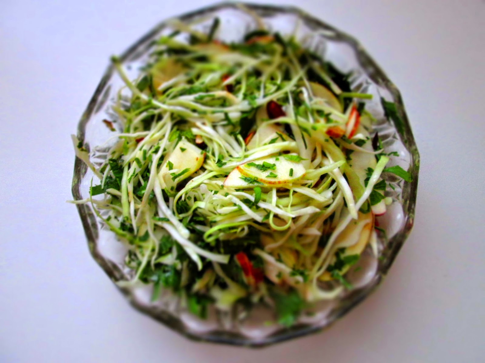 5) Bland kål, æble og persille i en skål, lav nedenstående vinaigrette og drys mandlerne ovenpå (hak dem eventuelt i mindre stykker)