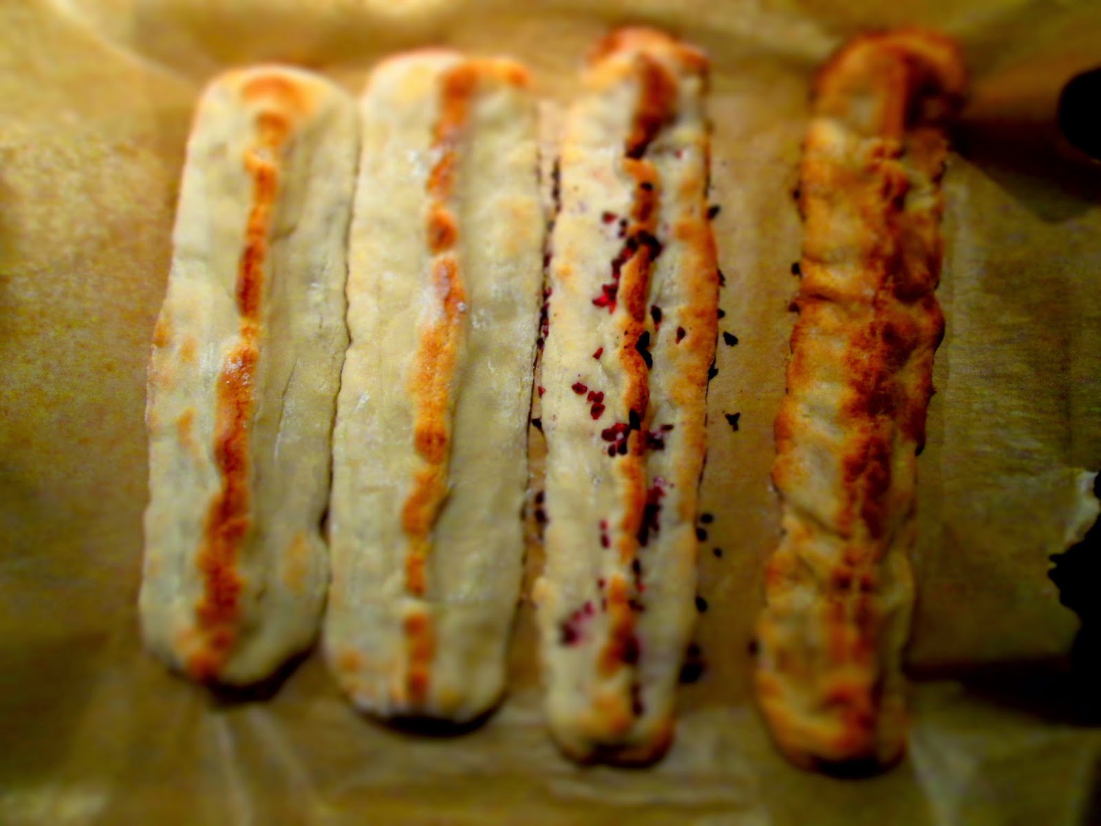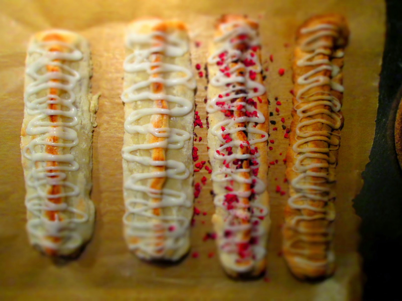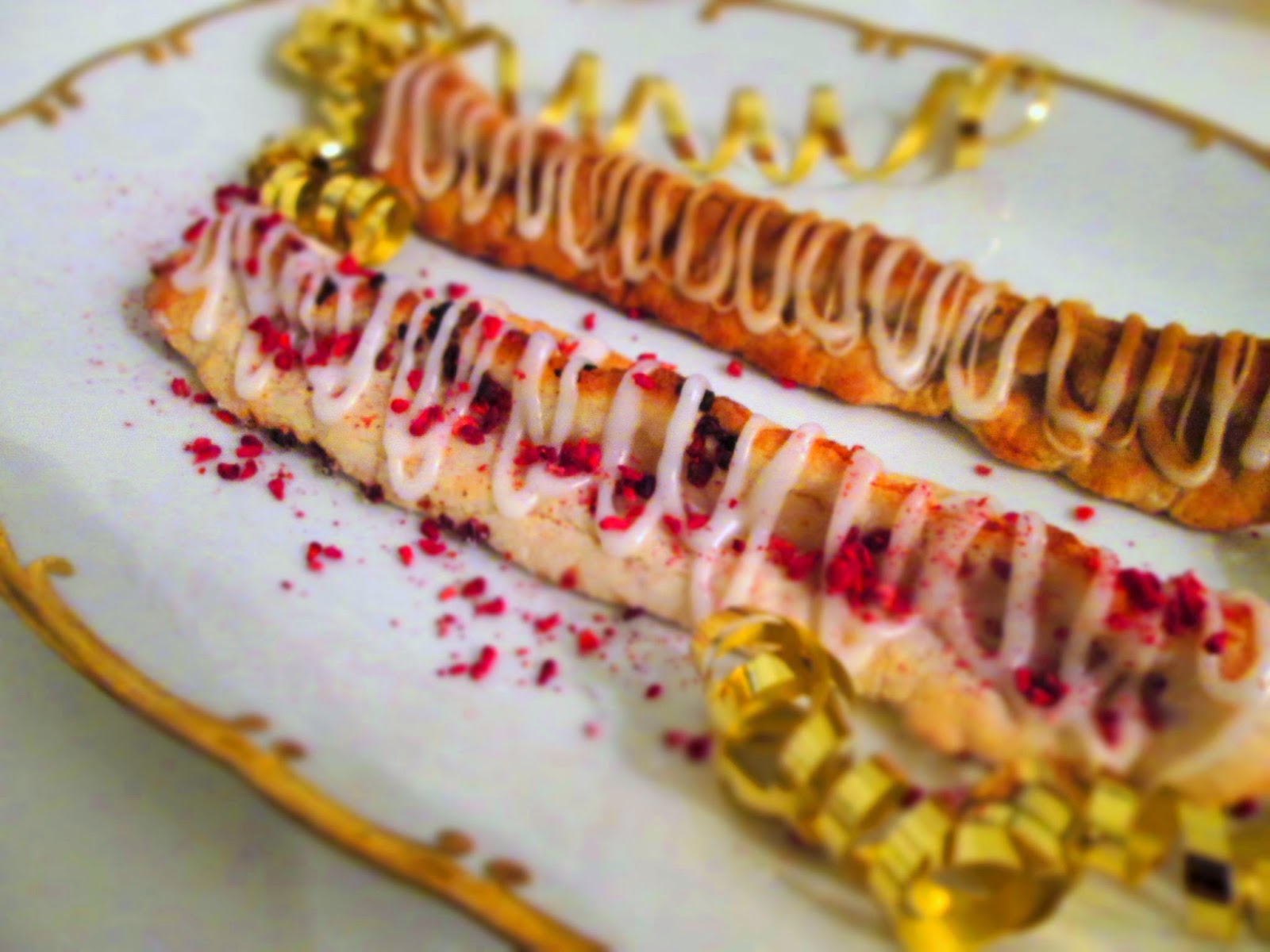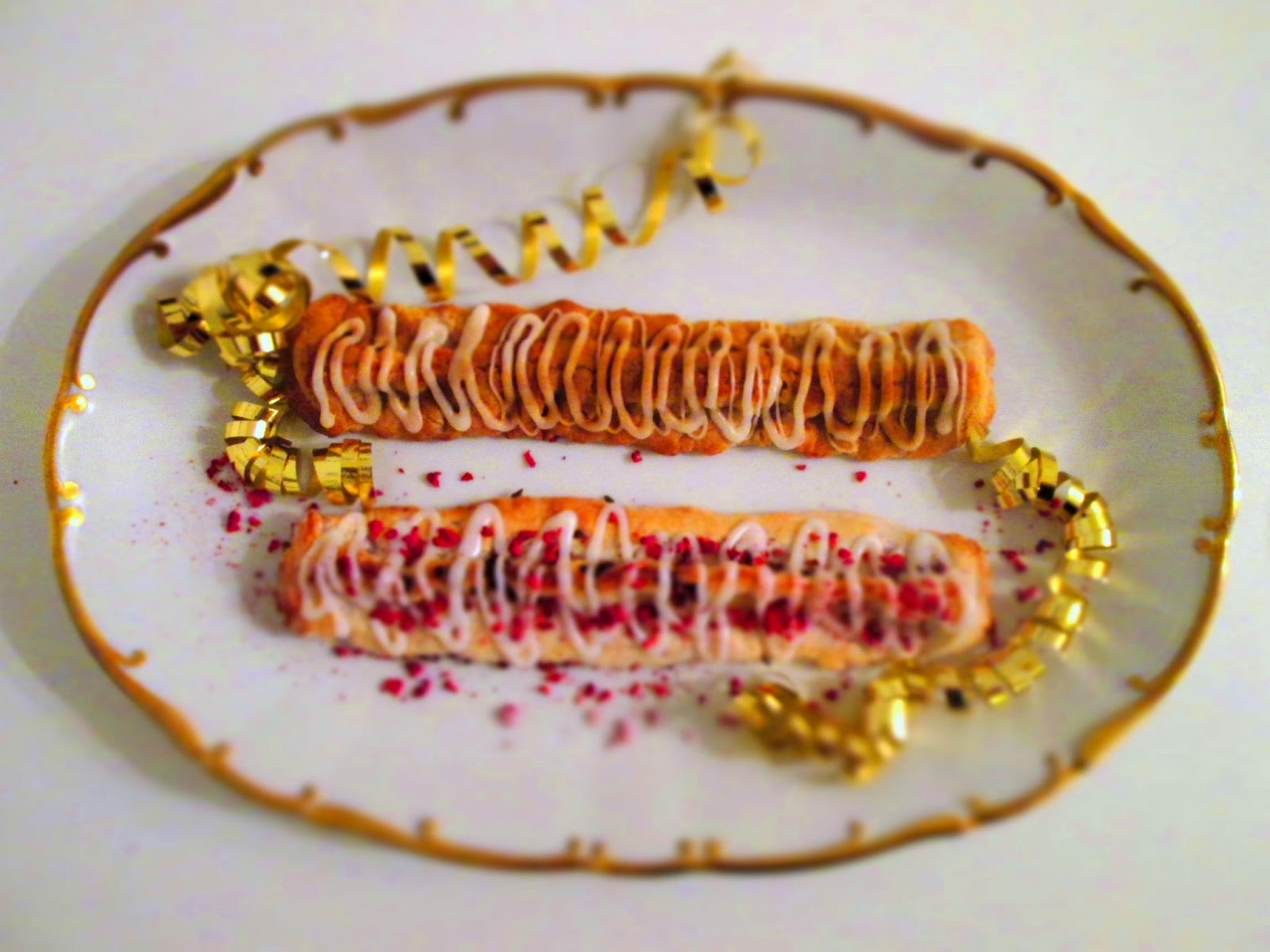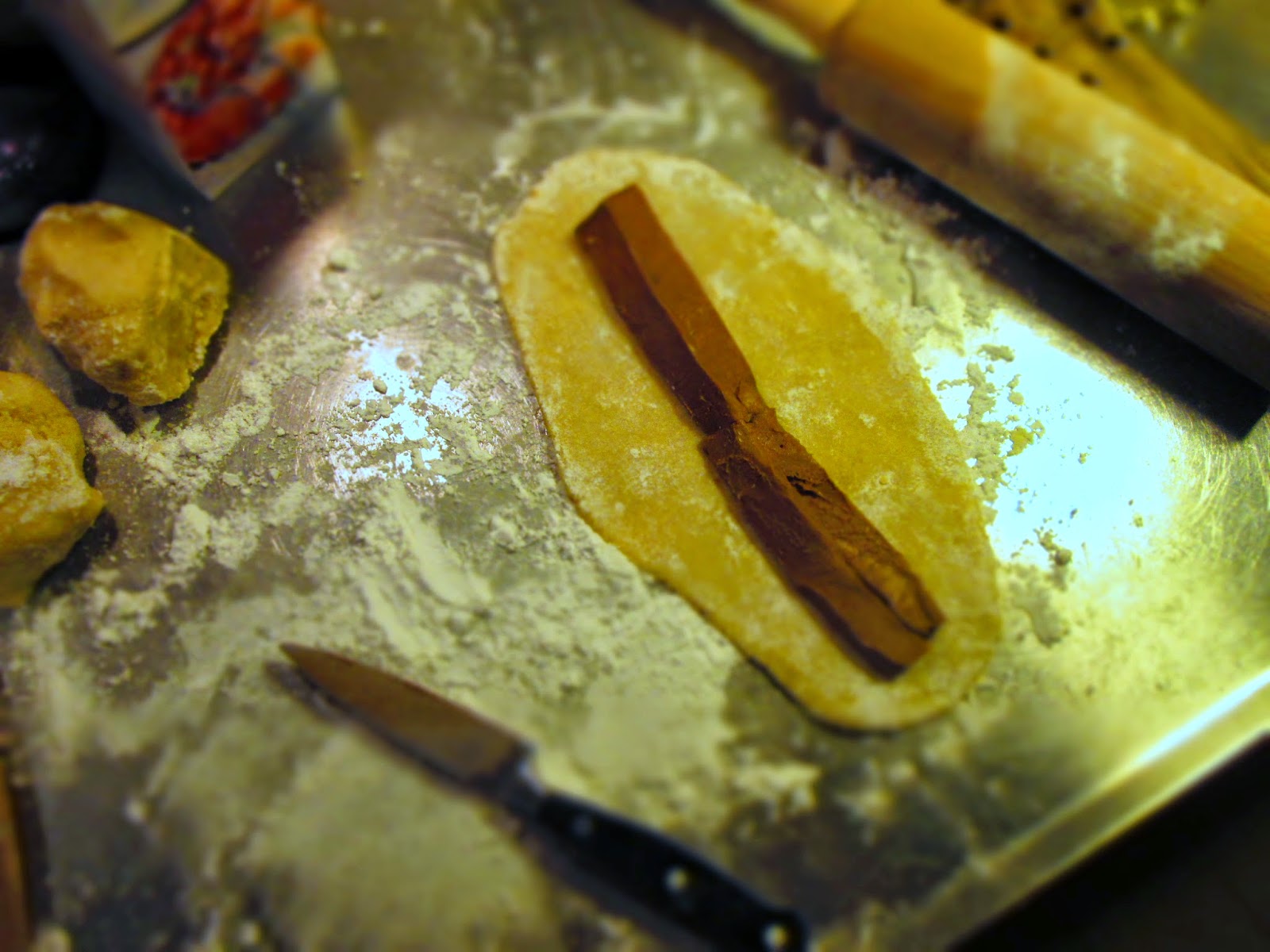 6) Hvis du ønsker at lave lakrids- eller hindbær kransekage æltes frysetørrede hindbær eller lakridspulver ind i dejen. Hvis du vil lave dem med nougat, skæres det i tynde skiver og kransekage dejen foldes omkring.