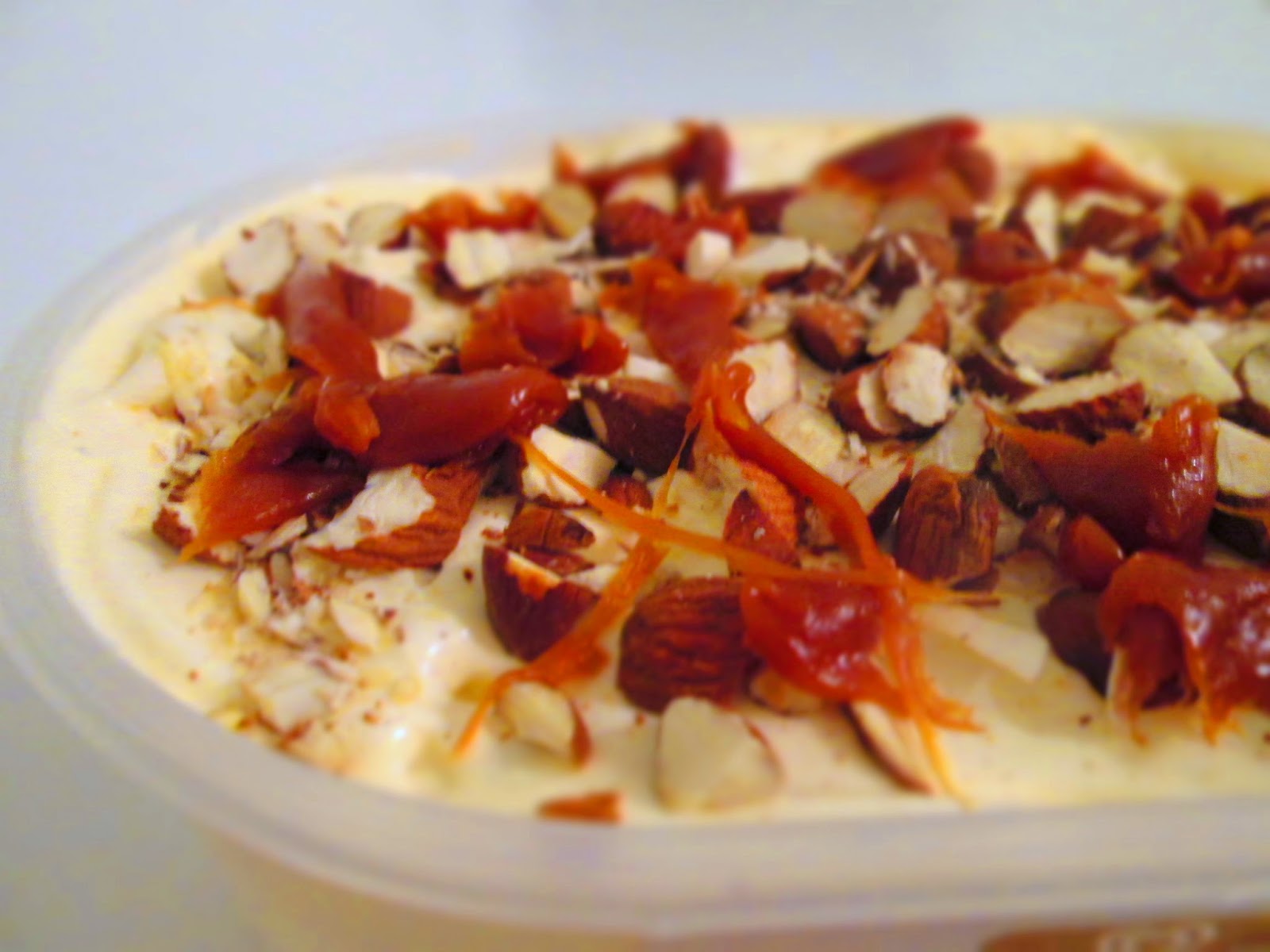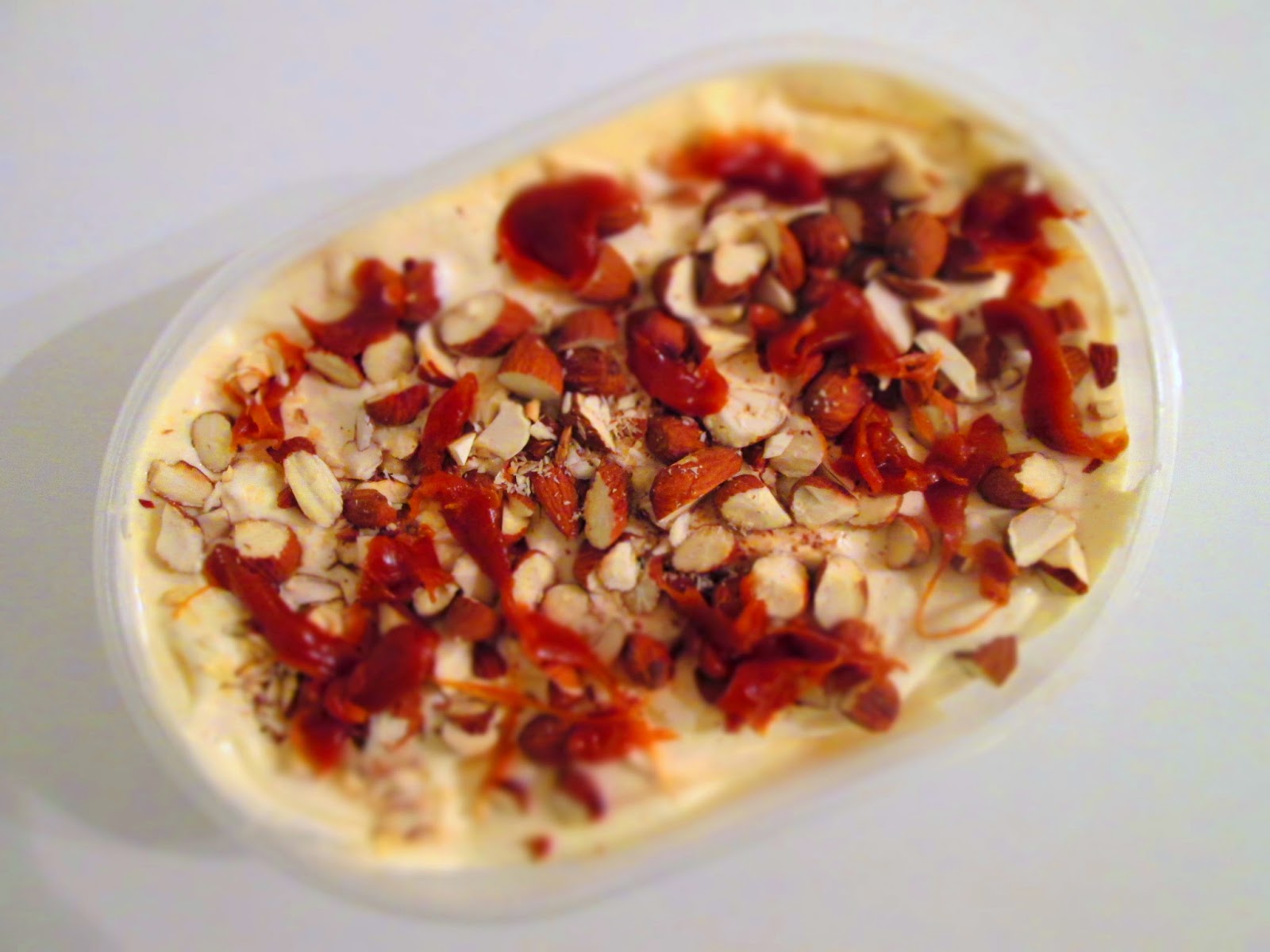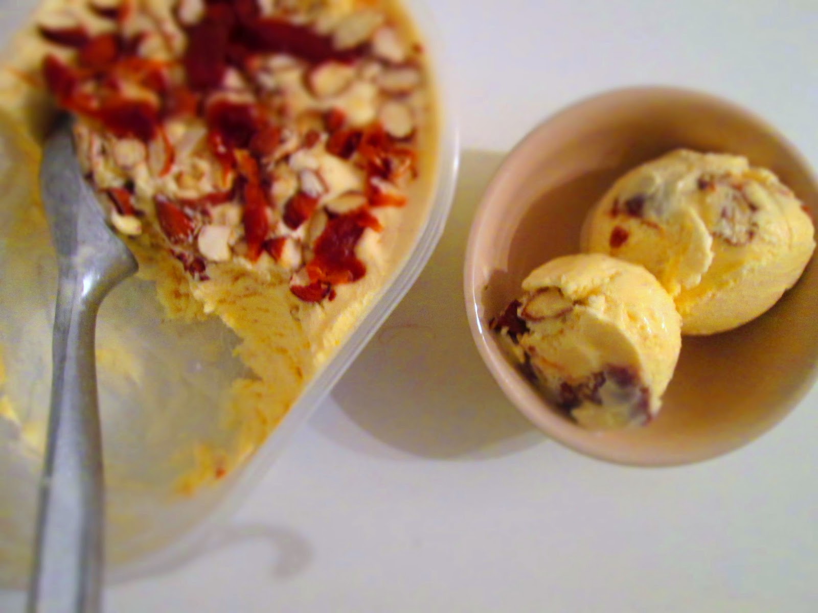 7) Når isen er færdig hældes den i en isboks og der drysses med ristede mandler og hældes saltkaramelsovs udover