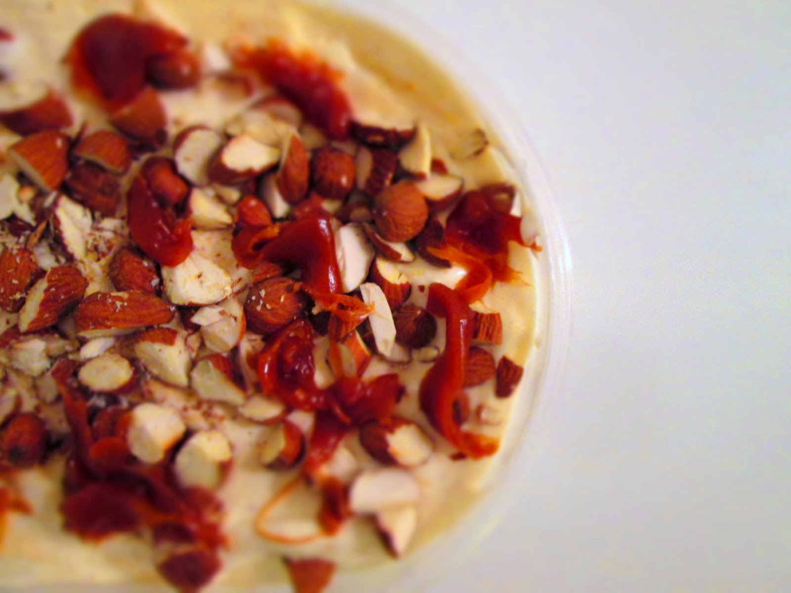 Rigtig dejlig is med saltkaramel og ristede mandler på toppen