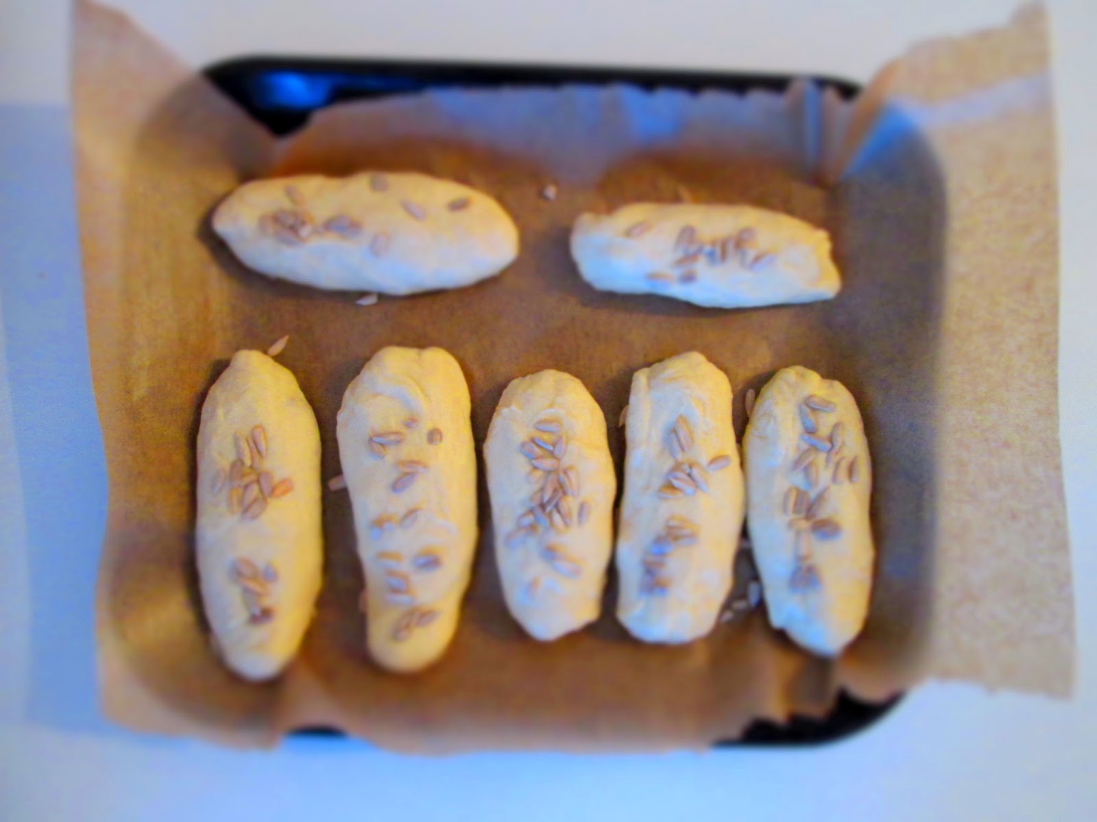 6) Form og rul hvert pølsebrød og drys evt. mes sesamfrø eller solsikkekerner