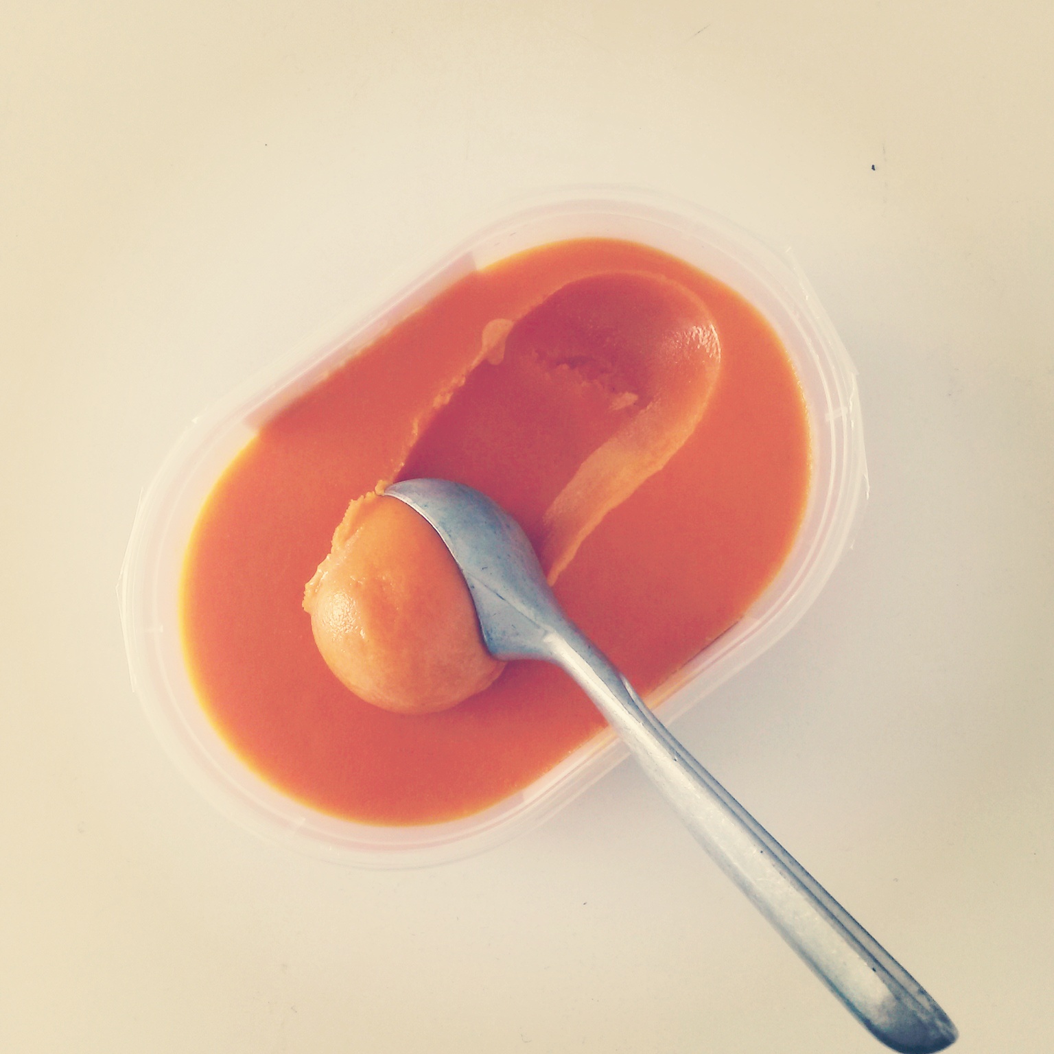 Det er så blevet til denne meget bløde og lækre sorbet lavet af ren havtorn samt en sukkerlage. En anden gang tror jeg at jeg vil prøve at opdele det i halv havtorn og halv appelsin eller æble, da havtorne smagen godt kan være lige kraftig nok. Men skøn - det er den! Og super frisk på sin helt egen eksotiske måde :)