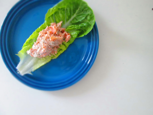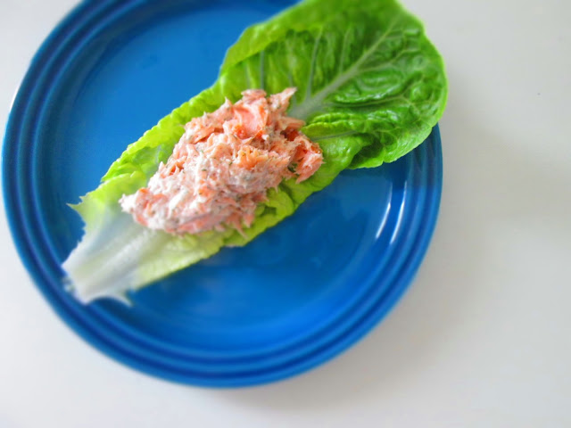 Det her er sådan en slags nem finger-food som jeg serverede til min fødselsdag i sidste uge. Jeg havde ikke prøvet at lave det før, men da jeg var helt blank på forretter, tænkte jeg at det bare skulle være noget let. Og da min lokale Aldi har de lækreste røget laksefileter, tænkte jeg at laksemousse serveret i romainesalatblade da lige måtte være sagen ;)