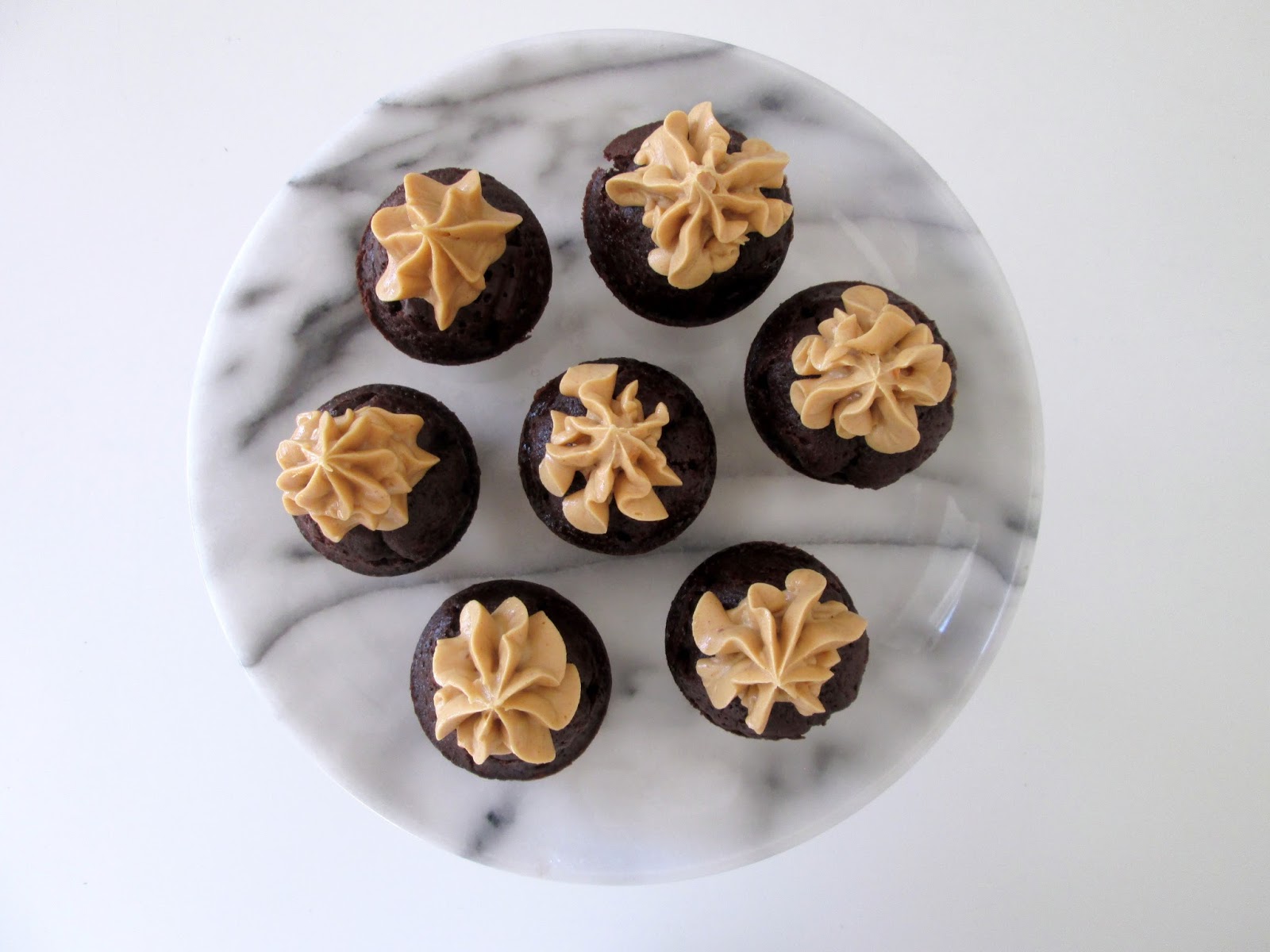 2) Put peanutbutterfrostingen i en sprøjtepose med stor tyl og sprøjt en lille top ud på hver minimuffin