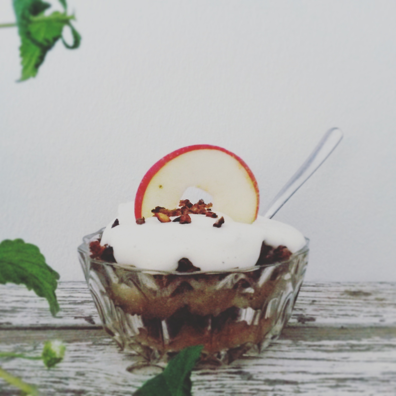 8) Når alt er koldt samles æblekagen lagvis med æblemos og rugbrødscrunch og der puttes flødeskum på toppen. Pynt evt. med friske æbleskiver og rugbrødscrunch