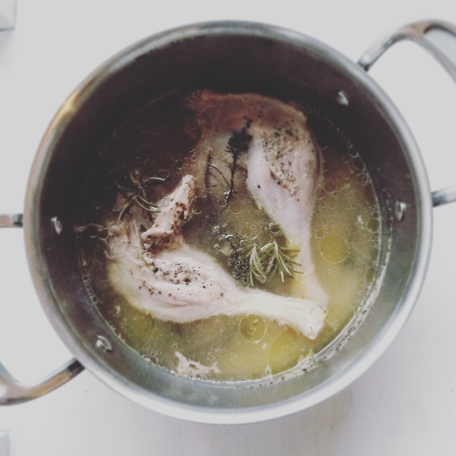 1) Riv/skær skindet af andelårene og kog dem i letsaltet vand (evt. med to laurbærblade og lidt frisk timian og rosmarin) i ca. 20 minutter, eller indtil andekødet er kogt