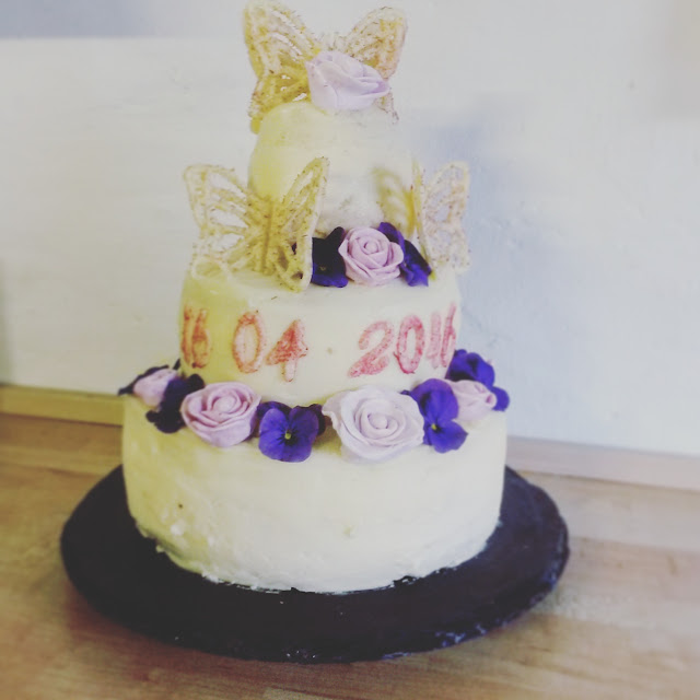 Bryllupskagen endte med at blive så fin da den fik blomster og chokoladepynt på, og jeg er selv meget stolt af resultatet og brudeparret var heldigvis glade ;) Den smagte derudover også super godt!