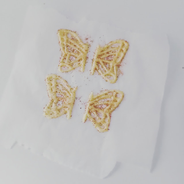 | Sommerfugle lavet af hvid chokolade drysset med frysetørret rabarber |
